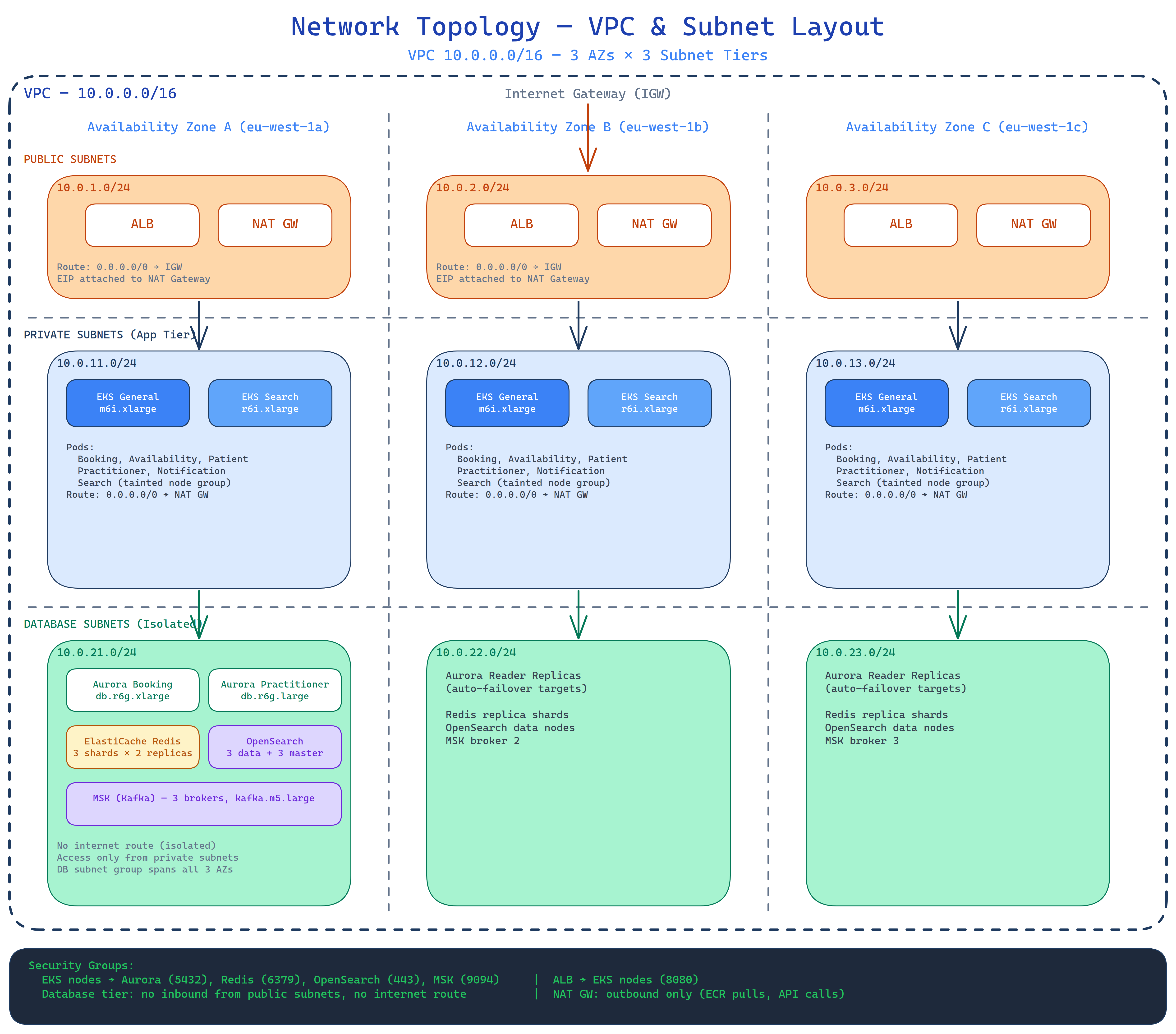 | Private (3) | One per AZ | EKS worker nodes, ElastiCache, OpenSearch, MSK brokers |