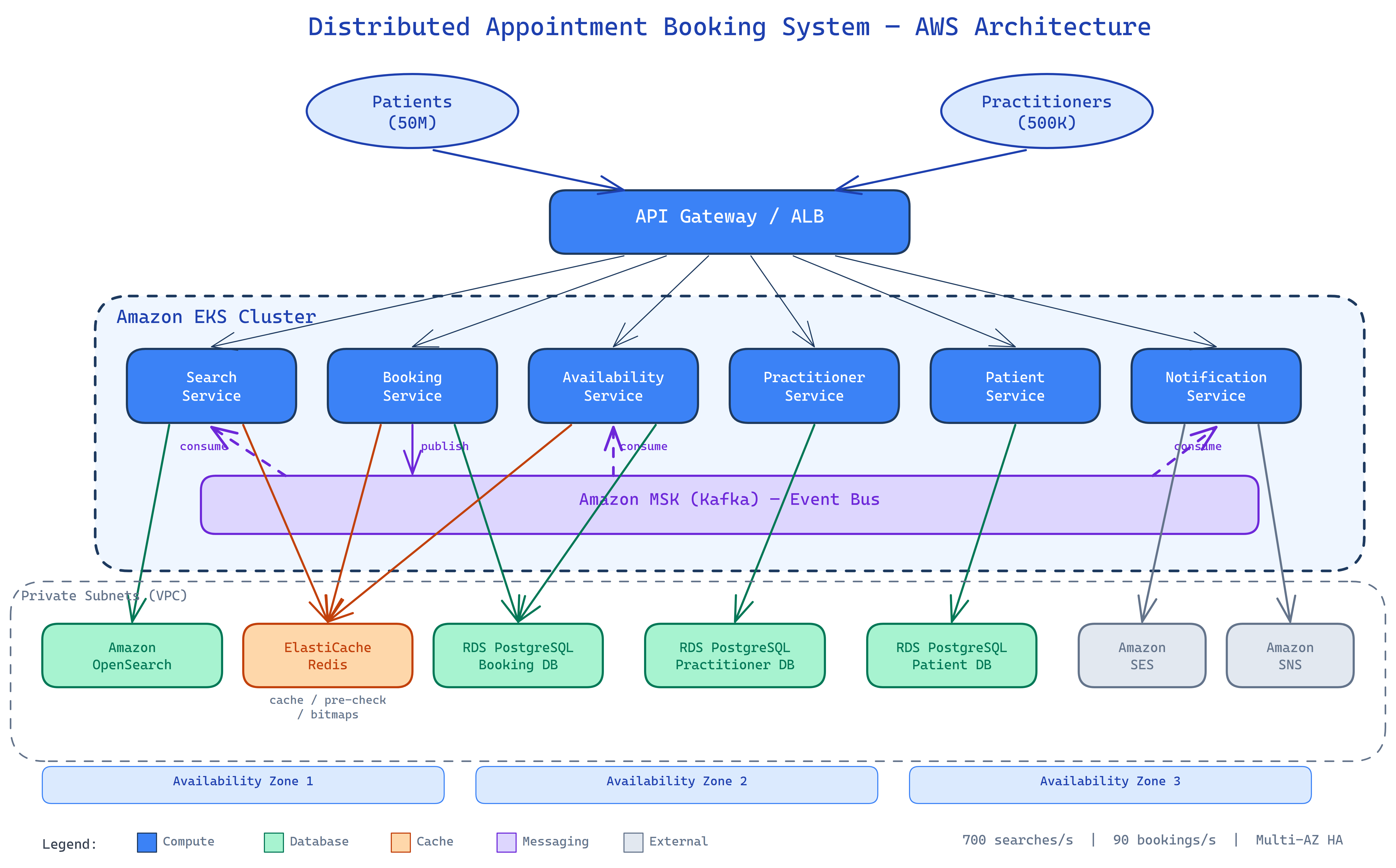All services run behind a Kubernetes Horizontal Pod Autoscaler. The Search Service runs on its own memory-optimised node group (r6i.xlarge). Critical services (Booking, Availability, Patient) deploy via canary to limit blast radius.